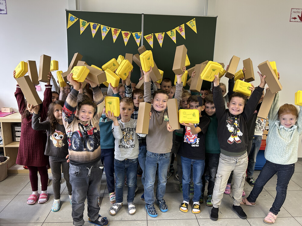 Unsere neuen Erstklässler durften sich über eine tolle Überraschung freuen: Im Rahmen der Biobrotboxaktion erhielt jedes der 55 Kinder eine praktische Trinkflasche und eine eigene Pausenbox – perfekt für gesunde Leckereien in der Pause.